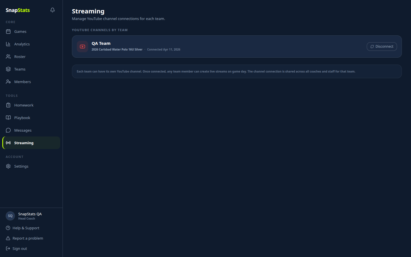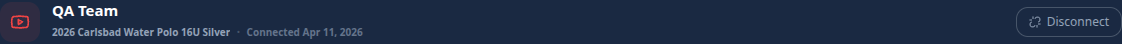 Go to the Streaming page and confirm your team's card shows a connected channel name with a Disconnect button. If it still says Connect, finish the OAuth flow. Remember the 24-hour YouTube verification wait.