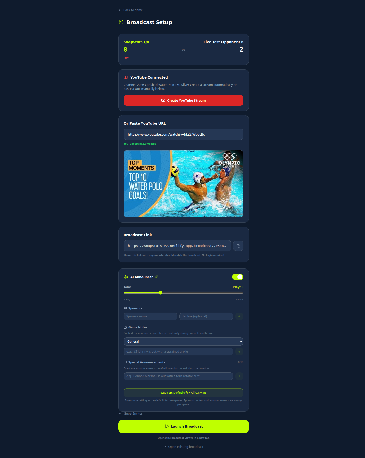 Open the game on the web at snapstats.app → Broadcast tab → Open Broadcast Setup. Do this before going live.