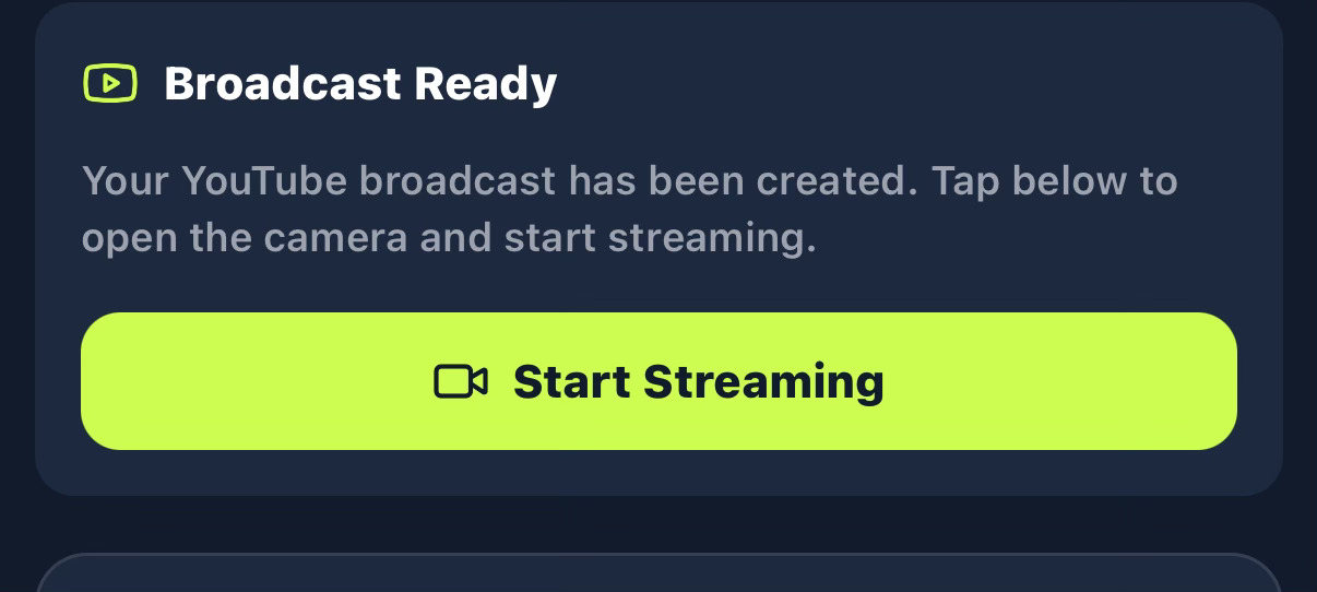 - Tap Go Live on YouTube — this creates the YouTube broadcast