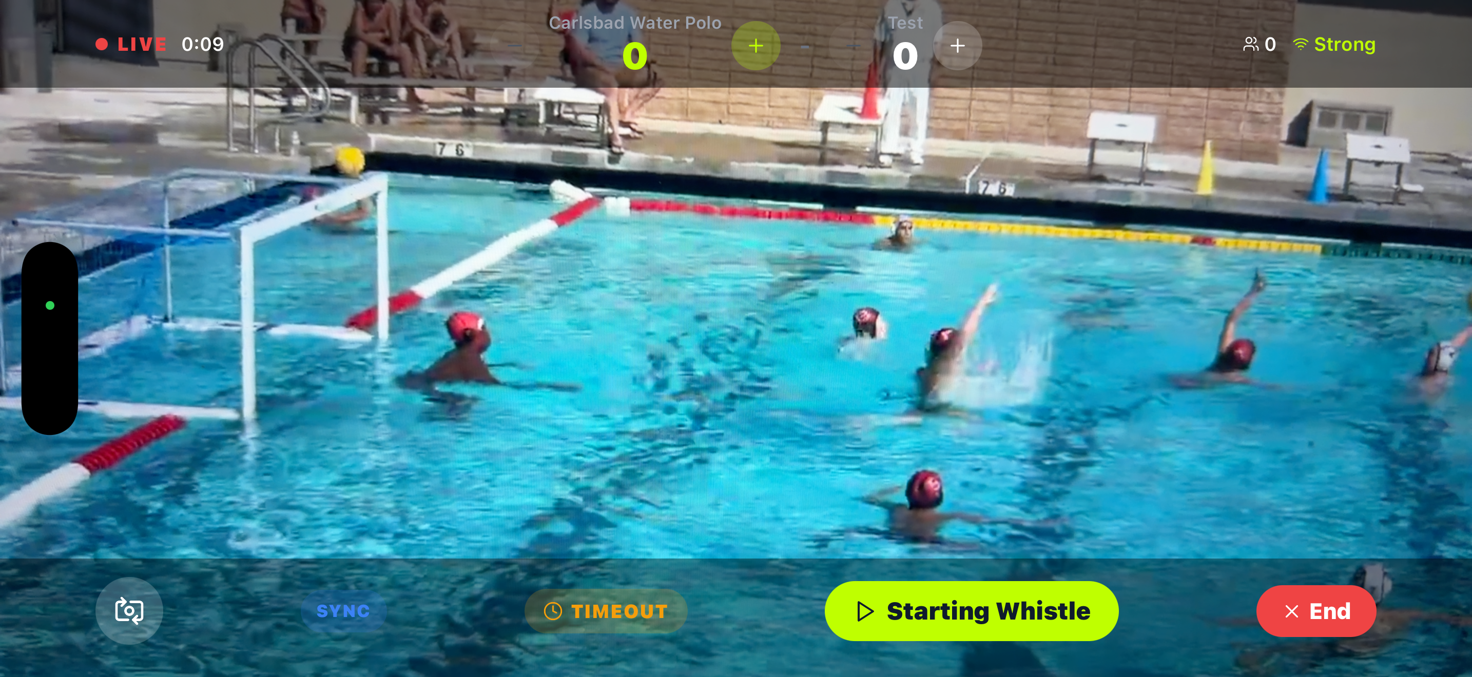 There is a 10 to 30 second delay between live action at the venue and the stream playing at home. The exact delay depends on your signal strength. Calibrate at the start of every stream so the score updates, goal celebrations, and announcer calls land at the right moment for home viewers.